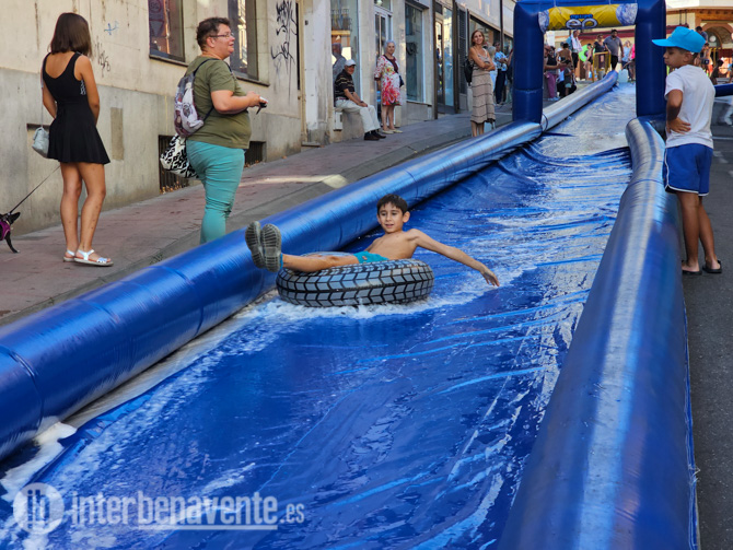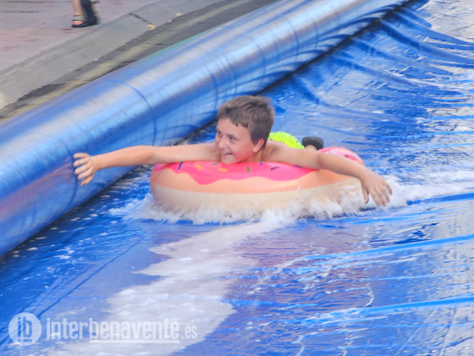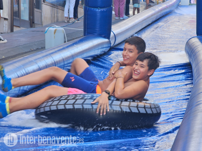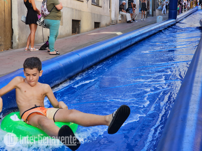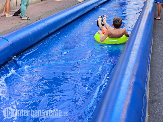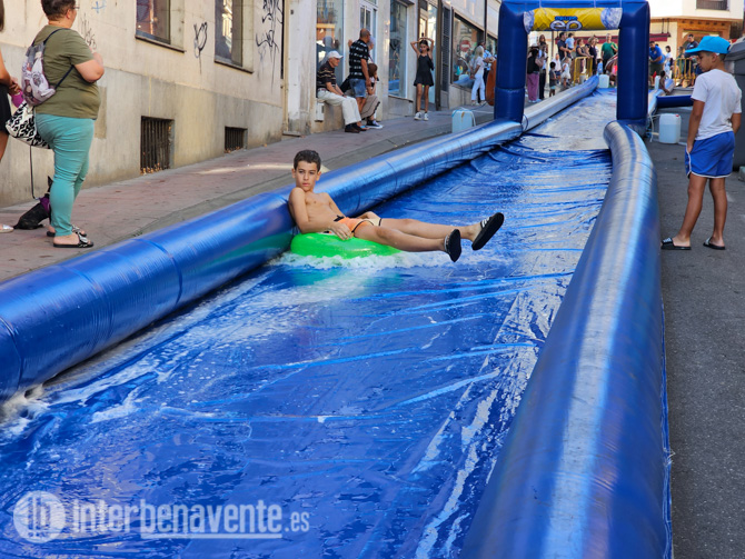Previo a que las casetas de las Ferias de Septiembre Productos de la Tierra comenzarán a abrirse esta tarde un largo tobogán acuático se desplegaba en la primera mitad de la Calle los Carros. Una cola de impacientes niños y también algún que otro adulto provistos de bañadores y colchonetas o flotadores deseaban poder zambullirse y deslizarse por esa superficie en la que el agua corría gracias a la manguera de los Bomberos de Benavente y el jabón vertido por la empresa encargada de este tobogán que ayudaba a avanzar a los participantes.