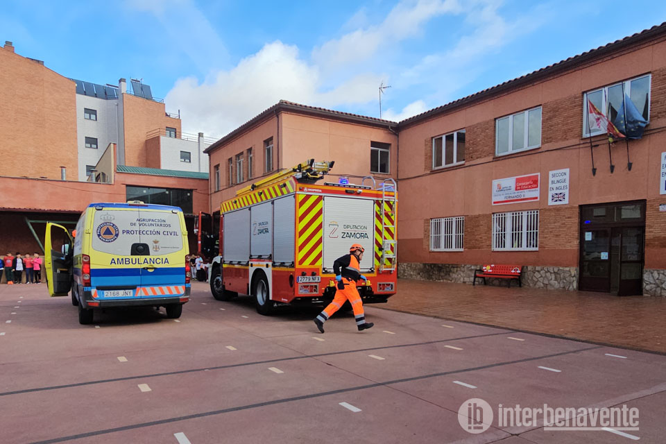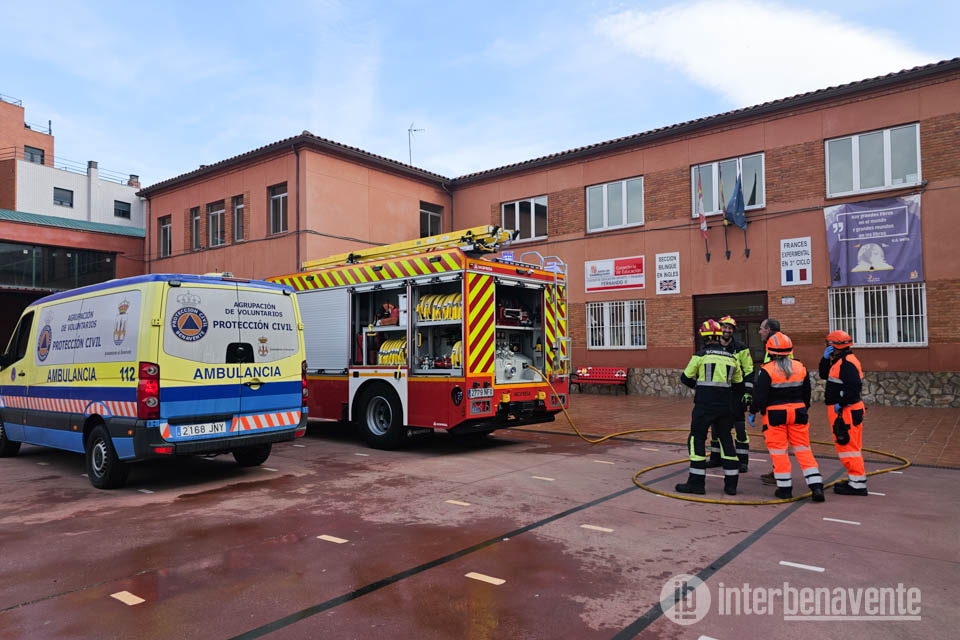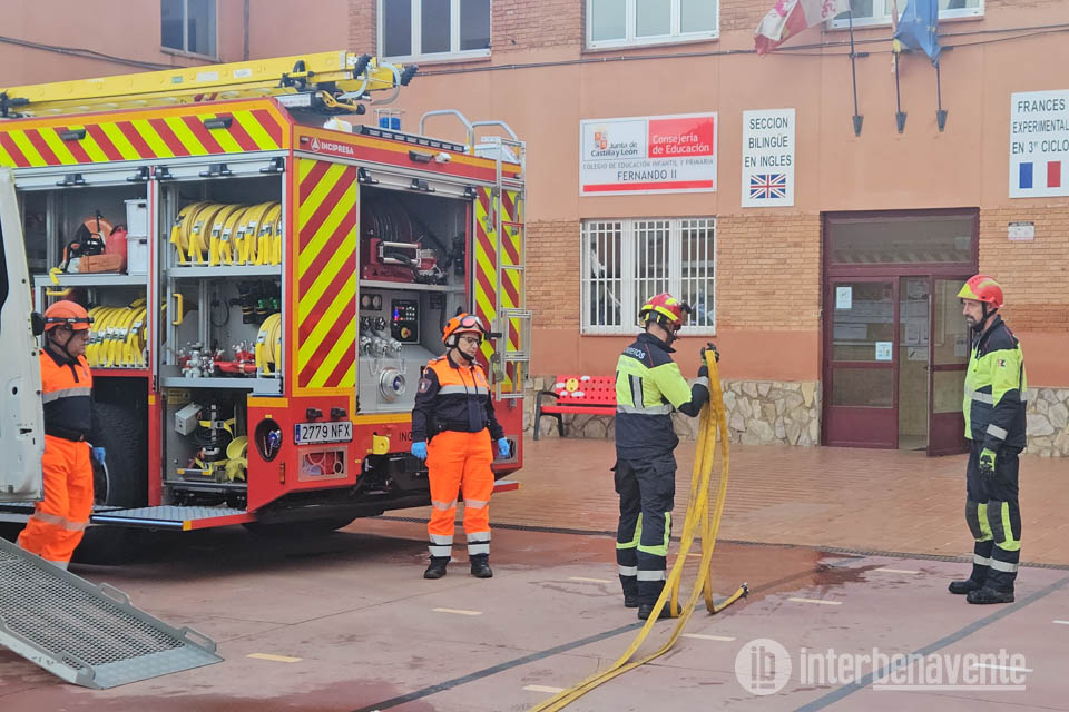 Tras confirmar que el colegio estaba vacío, los bomberos realizaron una exhibición del uso de la manguera de extinción, lo que despertó el interés de los alumnos. Además, los más pequeños tuvieron la oportunidad de subir a la ambulancia de Protección Civil y conocer su interior, aprendiendo de primera mano cómo actúan los equipos de emergencia.