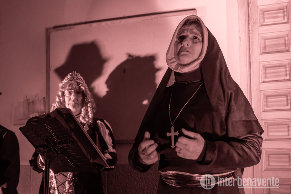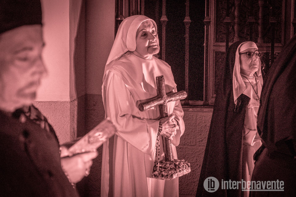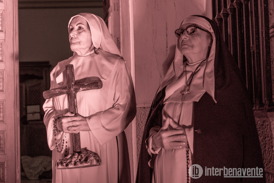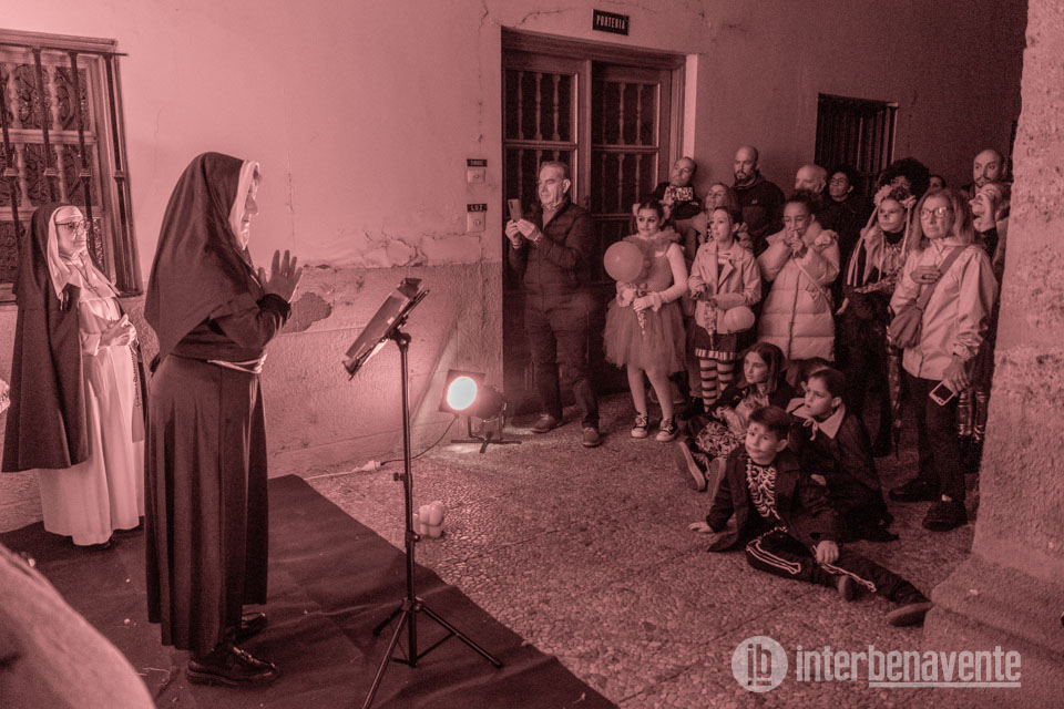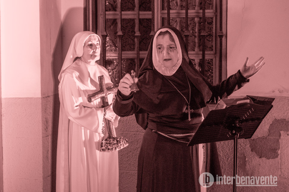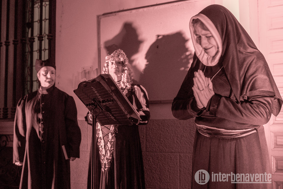 Desde el patio del Hospital, donde varias actrices encarnaron a personajes como la Reina Isabel, su confesor, la abadesa del Hospital, una novicia y Sor Patrocinio en una inquietante escena, el público acompañó a los intérpretes en su recorrido portando un carro y un farol, que guiaron la procesión hasta la Casa de Cultura La Encomienda. Allí continuó la acción en el hall de entrada con la historia de Don Giraldo y Elvira, hija del alcaide de Benavente, aunque inicialmente estaba previsto realizar esta parte en el arboreto del patio, si el tiempo lo hubiera permitido.