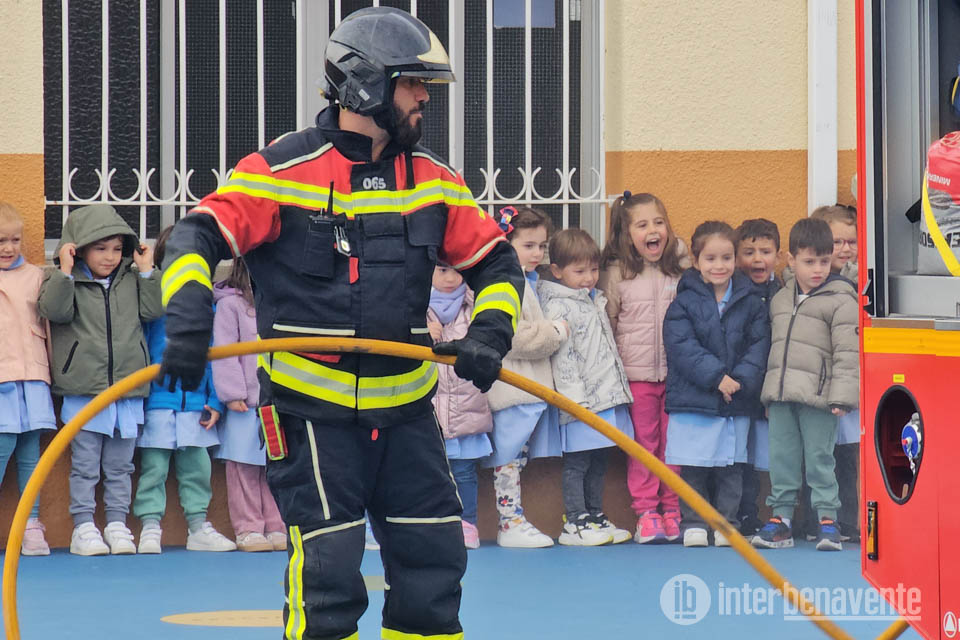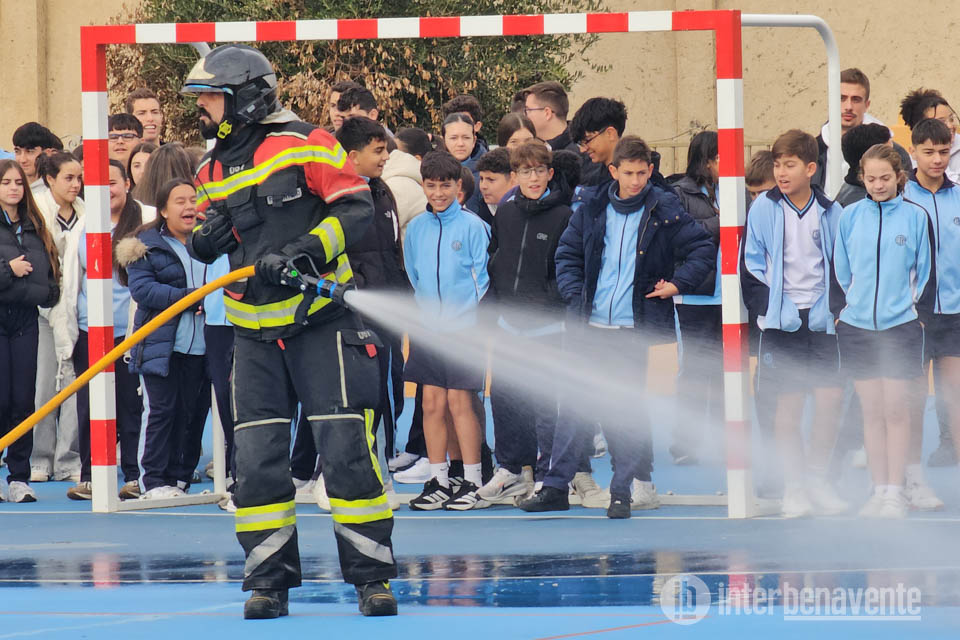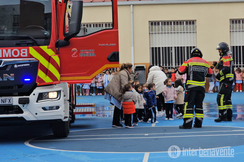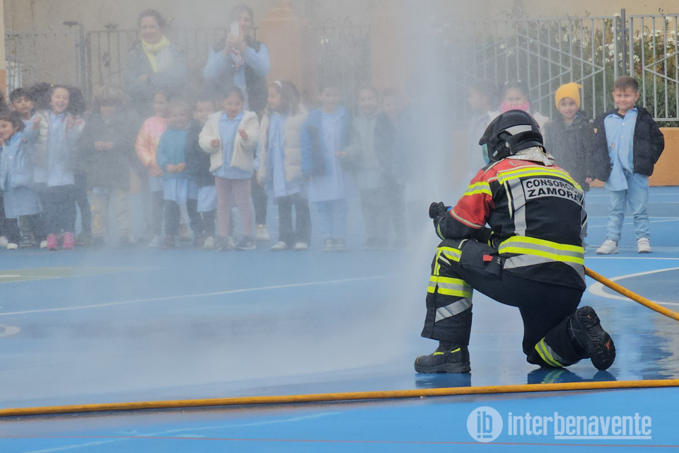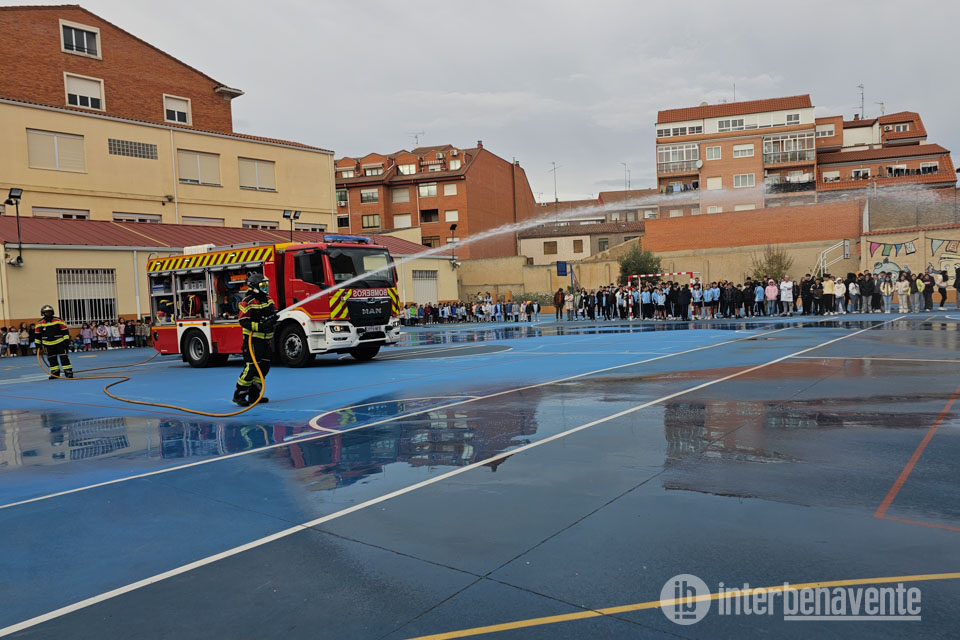 Así fueron los momentos desde que comenzaron a sonar las alarmas del colegio dando la orden de evacuación siguiendo los protocolos establecidos en el centro hasta llegar todos los alumnos, profesorado y personal de servicio al patio del colegio, donde los bomberos realizaron su ya tradicional exhibición con la manguera y se hicieron fotos con los más pequeños