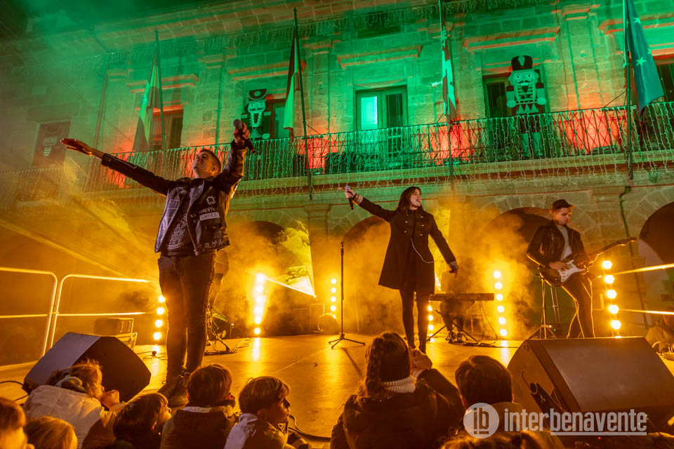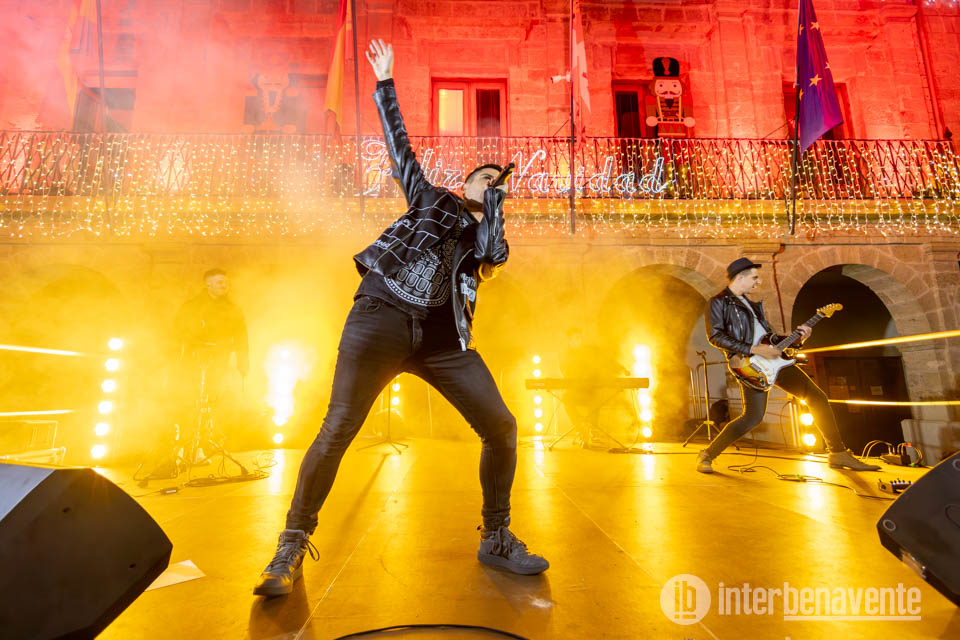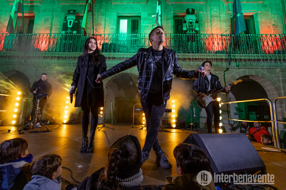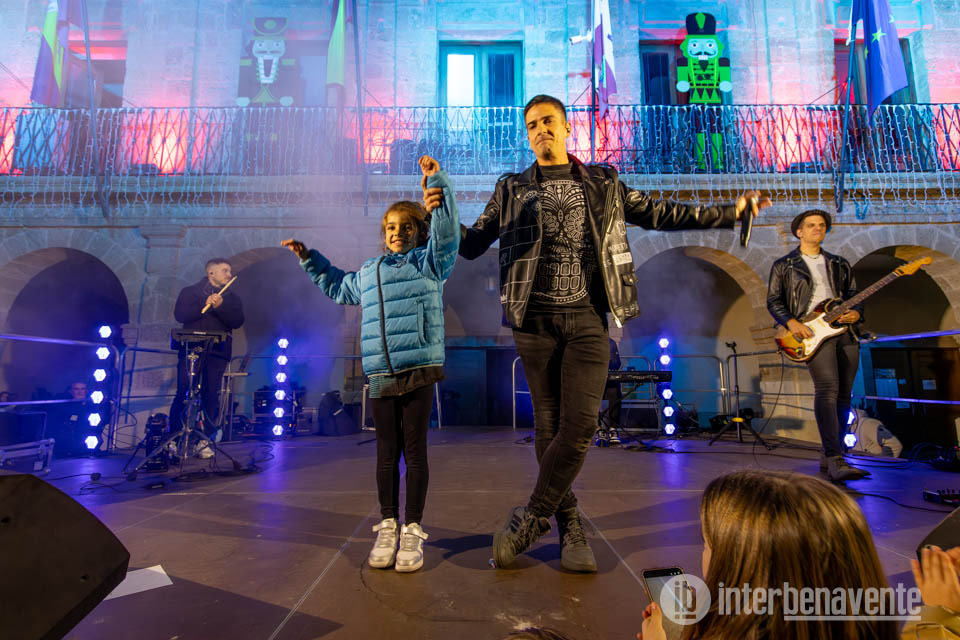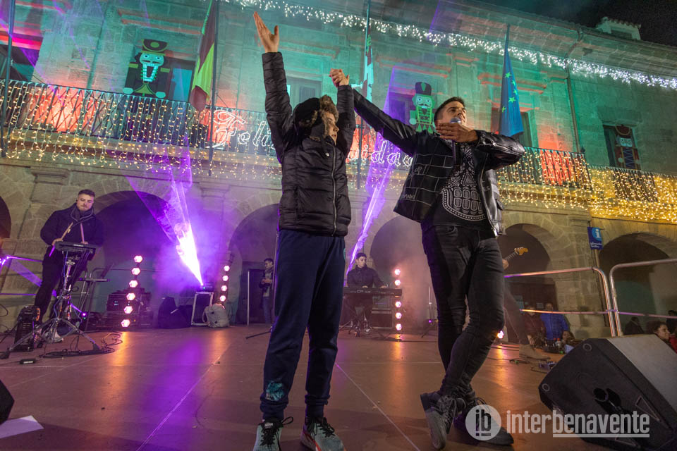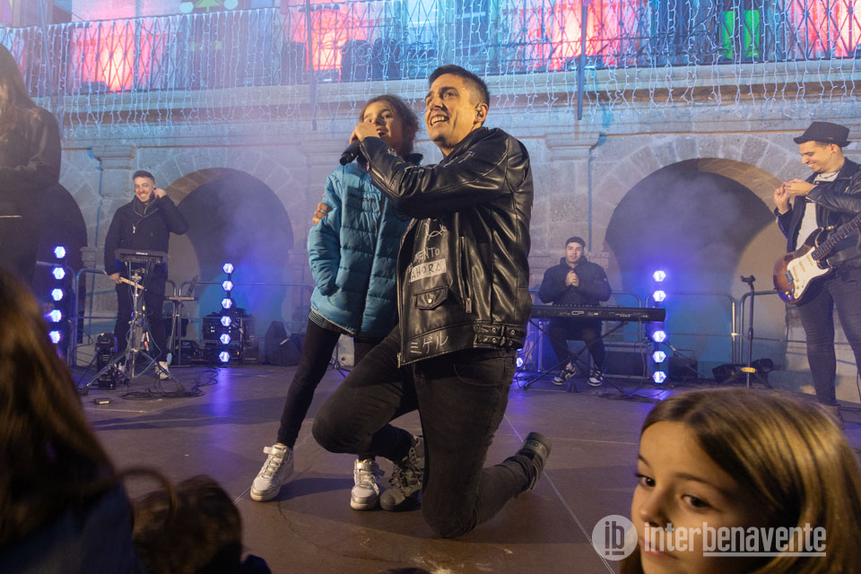 Y la música comenzó en la Plaza Mayor, con la energía característica del cantante zamorano Miguel Álvarez y su grupo Inadaptado, acompañados de la voz de Carmen Sánchez se animaban los minutos antes del encendido con grandes temas de pop-rock español que daba pie a que el público que cada año aumenta su presencia en la Plaza, se uniera en los coros.