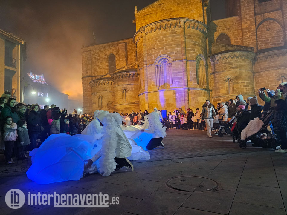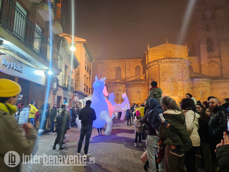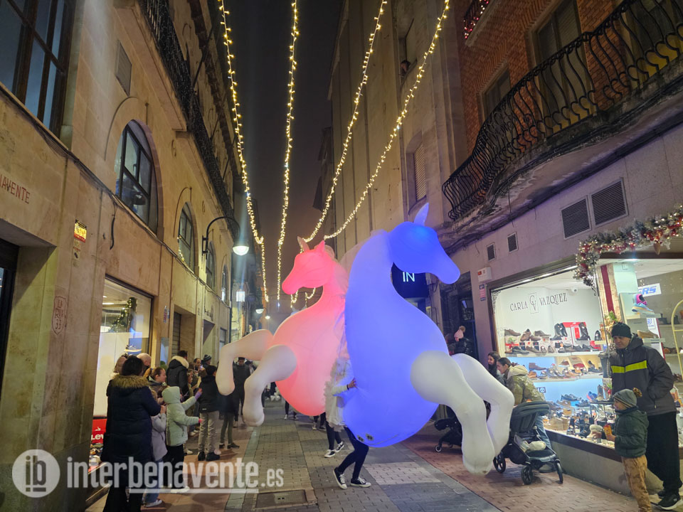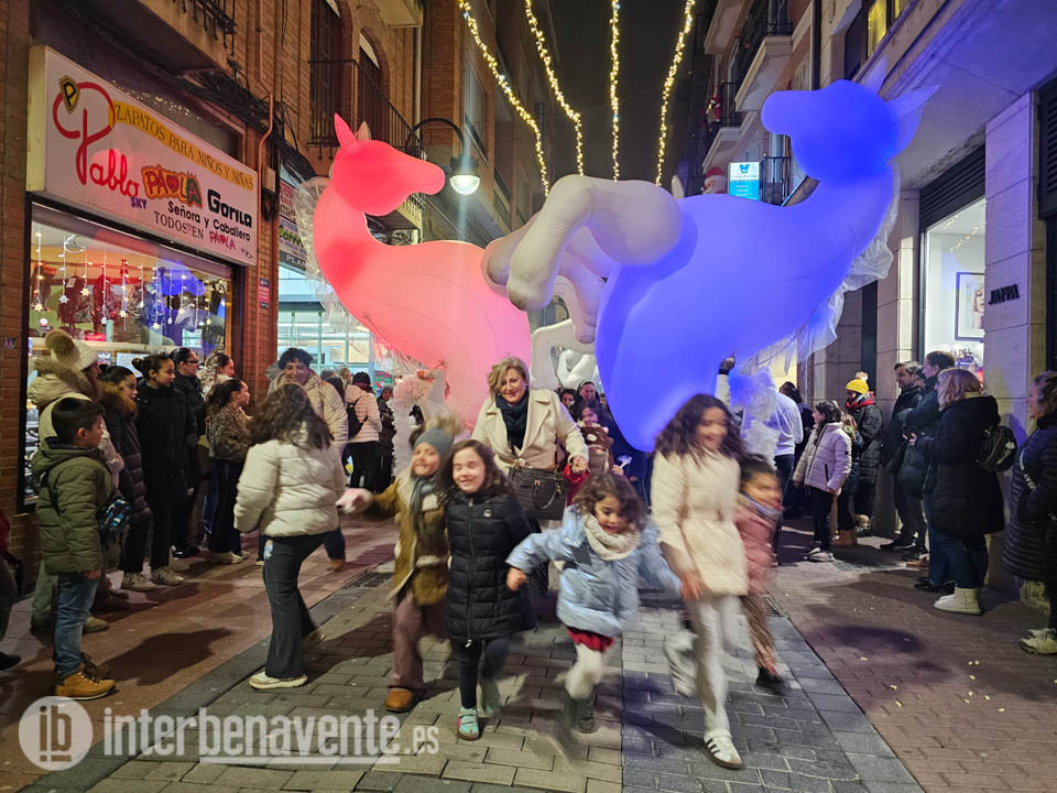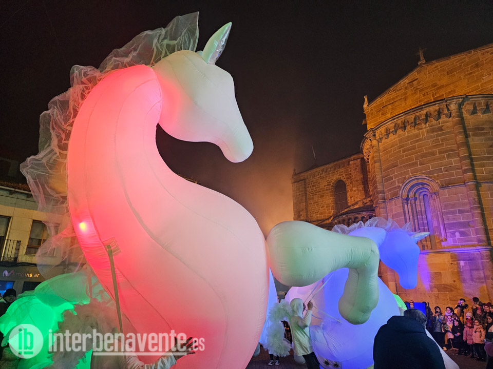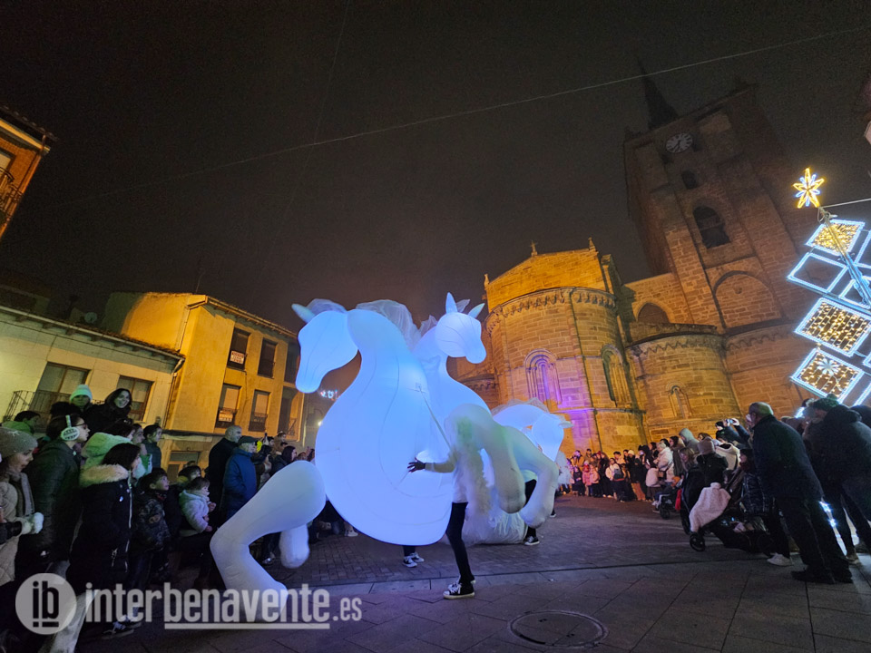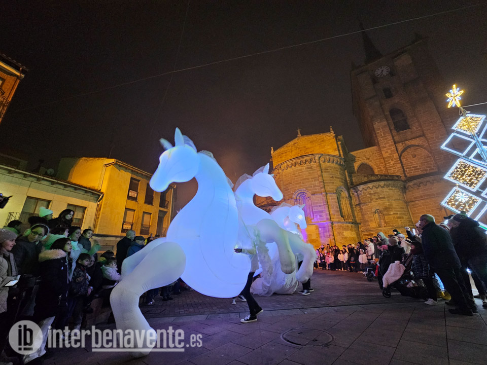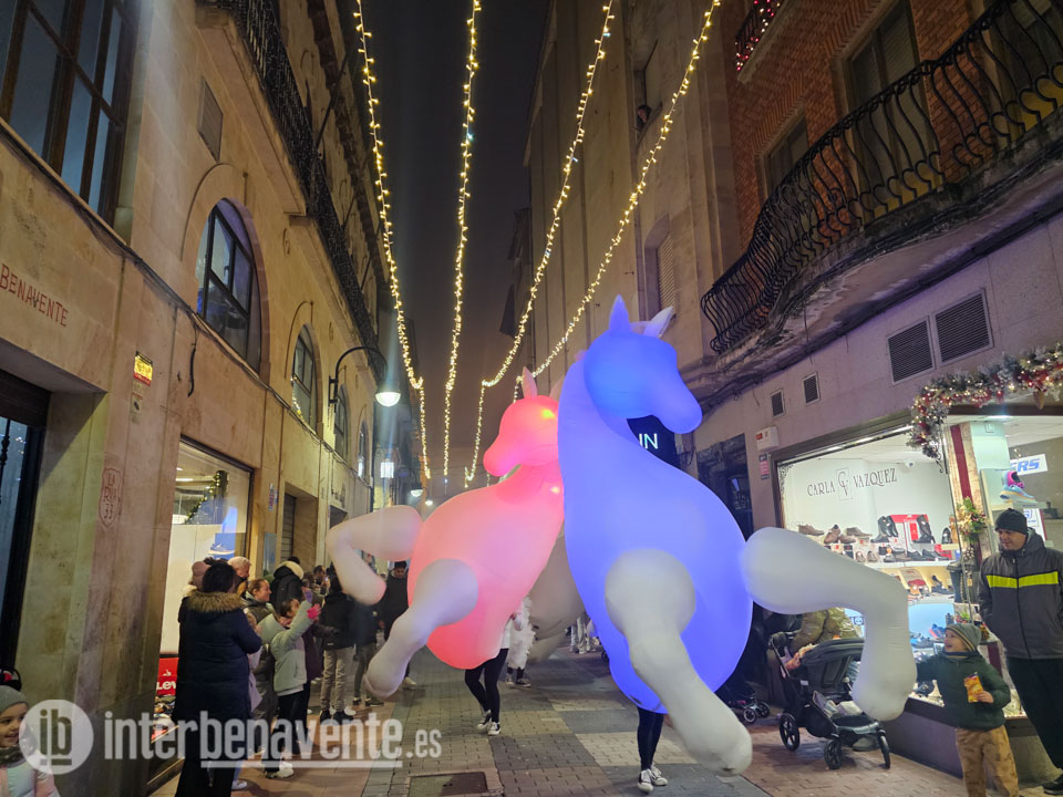 La expectación era máxima en las calles del centro de Benavente durante la tarde del domingo para disfrutar del espectáculo ‘Aéreon’. Niños y mayores recibían a estos grandes caballos blancos que iniciaban su recorrido en la Plaza de Santa María en una actividad organizada desde el Ayuntamiento.