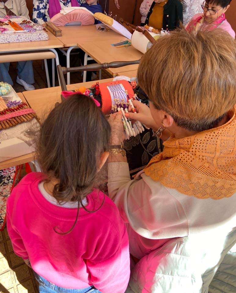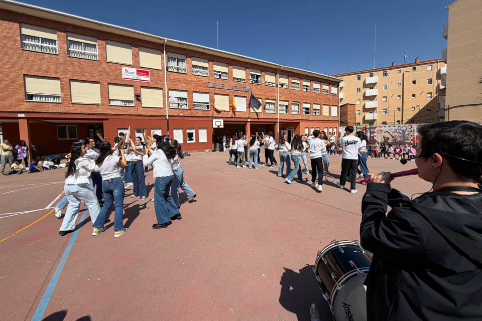 La mañana continuó con una actividad muy especial: 12 encajeras de bolillos enseñaron al alumnado esta labor tradicional. La jornada se detuvo para recibir a 36 alumnos del IES Los Sauces, que interpretaron piezas de paloteo popular y paloteo fusión en el patio, acompañados por su profesora de música.