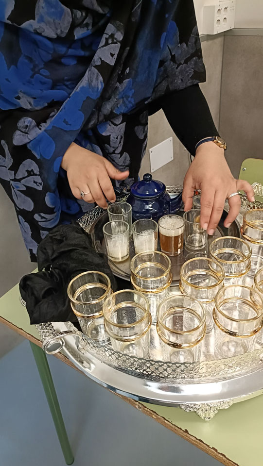 Diez madres de origen marroquí ofrecieron un taller de escritura árabe para 3º, 4º, 5º y 6º, donde los niños escribieron sus nombres en árabe y conocieron el ritual del té. También realizaron dibujos corporales inspirados en la henna.