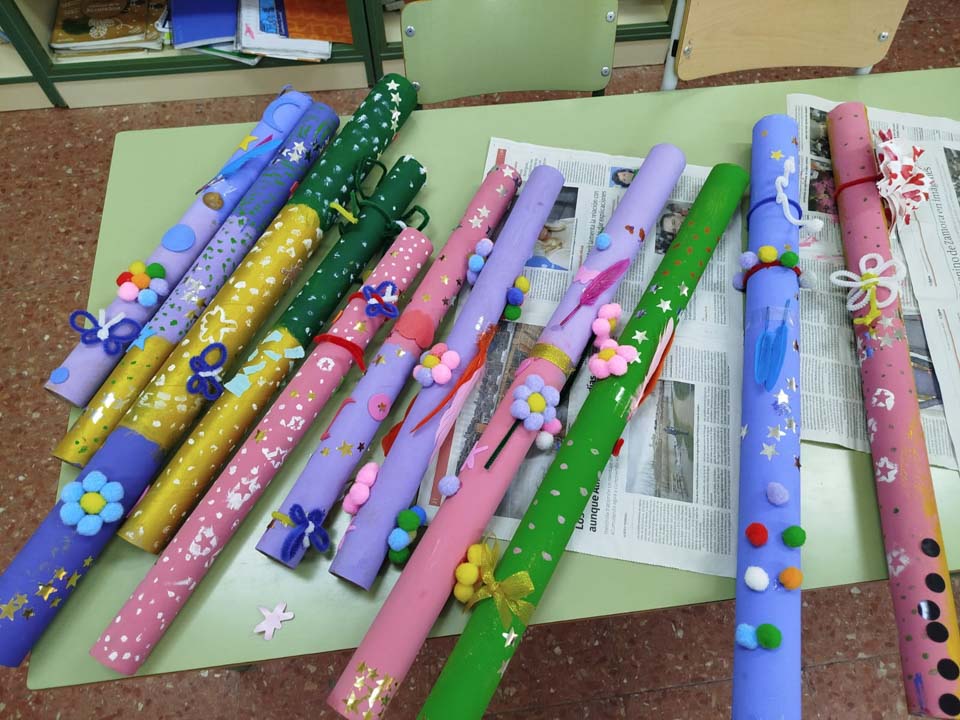 Tras el recreo, el colegio salió a la calle para susurrar poemas a los viandantes con tubos decorados durante la semana, invitando a la ciudadanía a entrar al patio para escuchar los versos. La actividad contó con la colaboración de las personas mayores del Centro de Día La Vega, gracias a la mediación del AMPA.