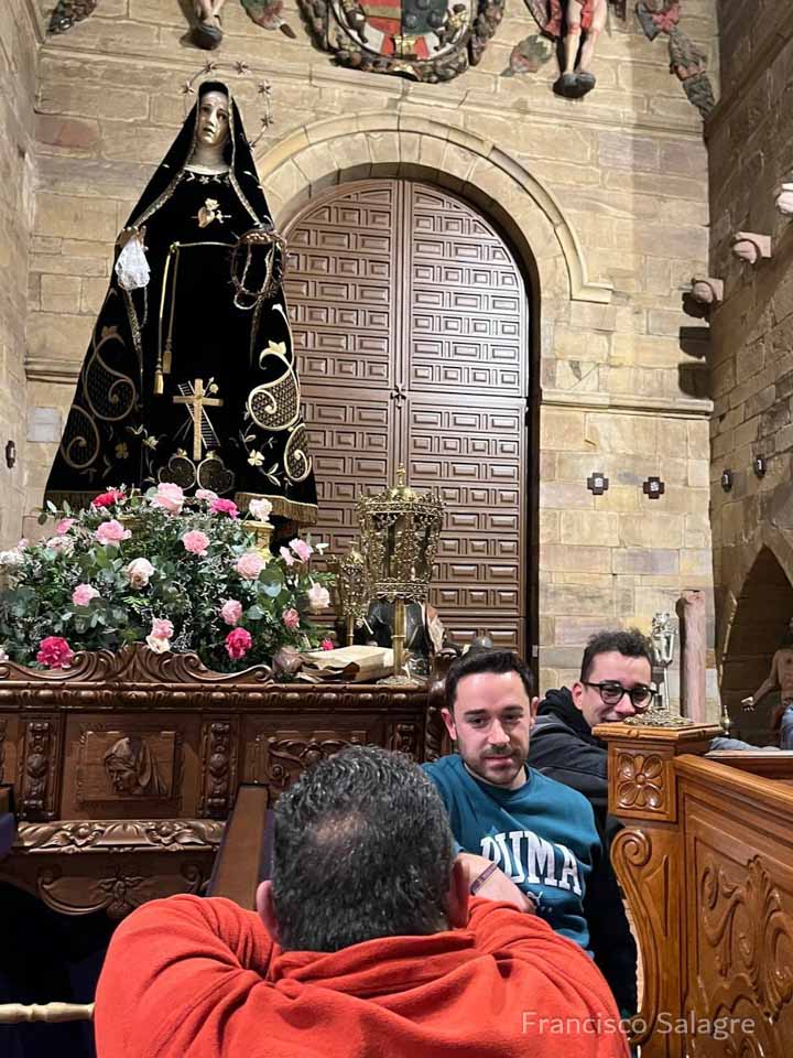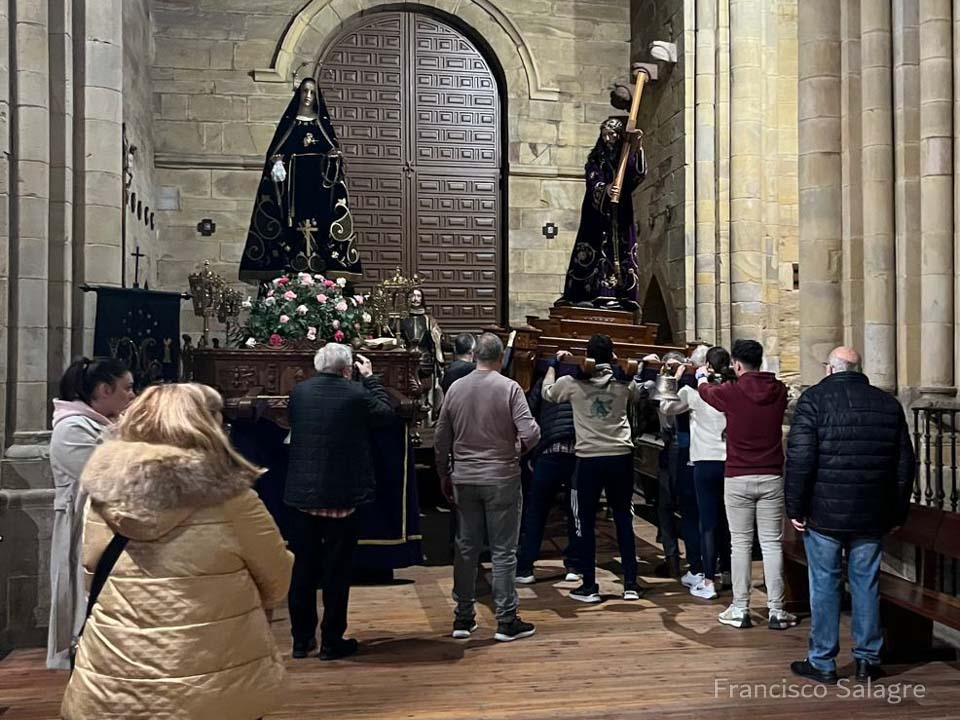 La Cofradía del Nazareno continúa esta semana con los preparativos para la tradicional Procesión del Encuentro, que volverá a celebrarse en la madrugada del Viernes Santo. La Virgen de los Dolores ya se encontraba preparada en sus andas desde la procesión del pasado viernes, lo que ha permitido agilizar los trabajos previos que habitualmente se realizaban este Lunes Santo.