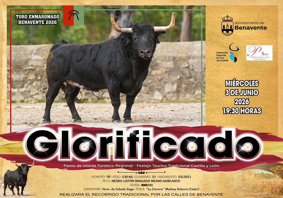 Glorificado se ha convertido en el protagonista de la Semana Grande del Toro Enmaromado que recorrerá las calles de Benavente el próximo 3 de junio. Un toro que sorprendido a los aficionados y corredores taurinos al conocer su procedencia, será el primer Cebada Gago que tendrá la fiesta, una de las ganaderías más prestigiosas del mundo taurino, conocida sobre todo por los encierros de Pamplona, sus astados son los más temidos por los corredores, calificándolos como los más rápidos y peligrosos.