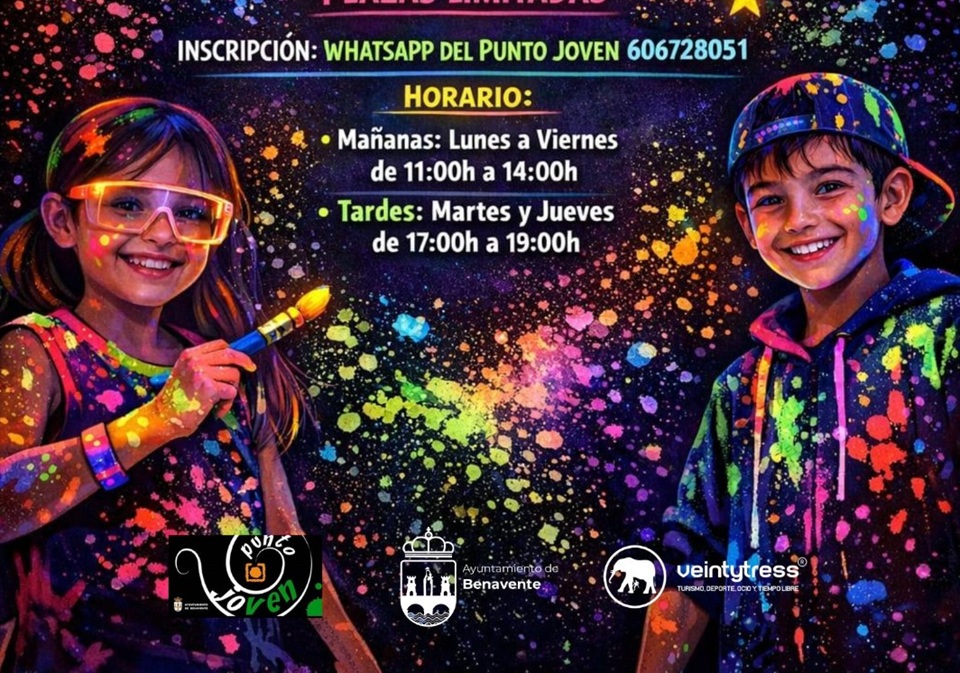 El Ayuntamiento de Benavente informa desde su Concejalía de Juventud que el próximo sábado, 25 de abril, con motivo del Día Nacional del niño y de la niña, tendrá lugar en el Punto Joven de Benavente una novedosa actividad, ’Neon Brush’, un taller de pintura fluorescente bajo luz ultravioleta para jóvenes a partir de 8 años.