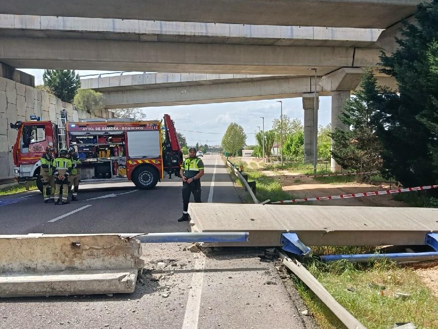 Una barrera de hormigón se desprende de un puente de la A 66 en el barrio de Villagodio en Zamora