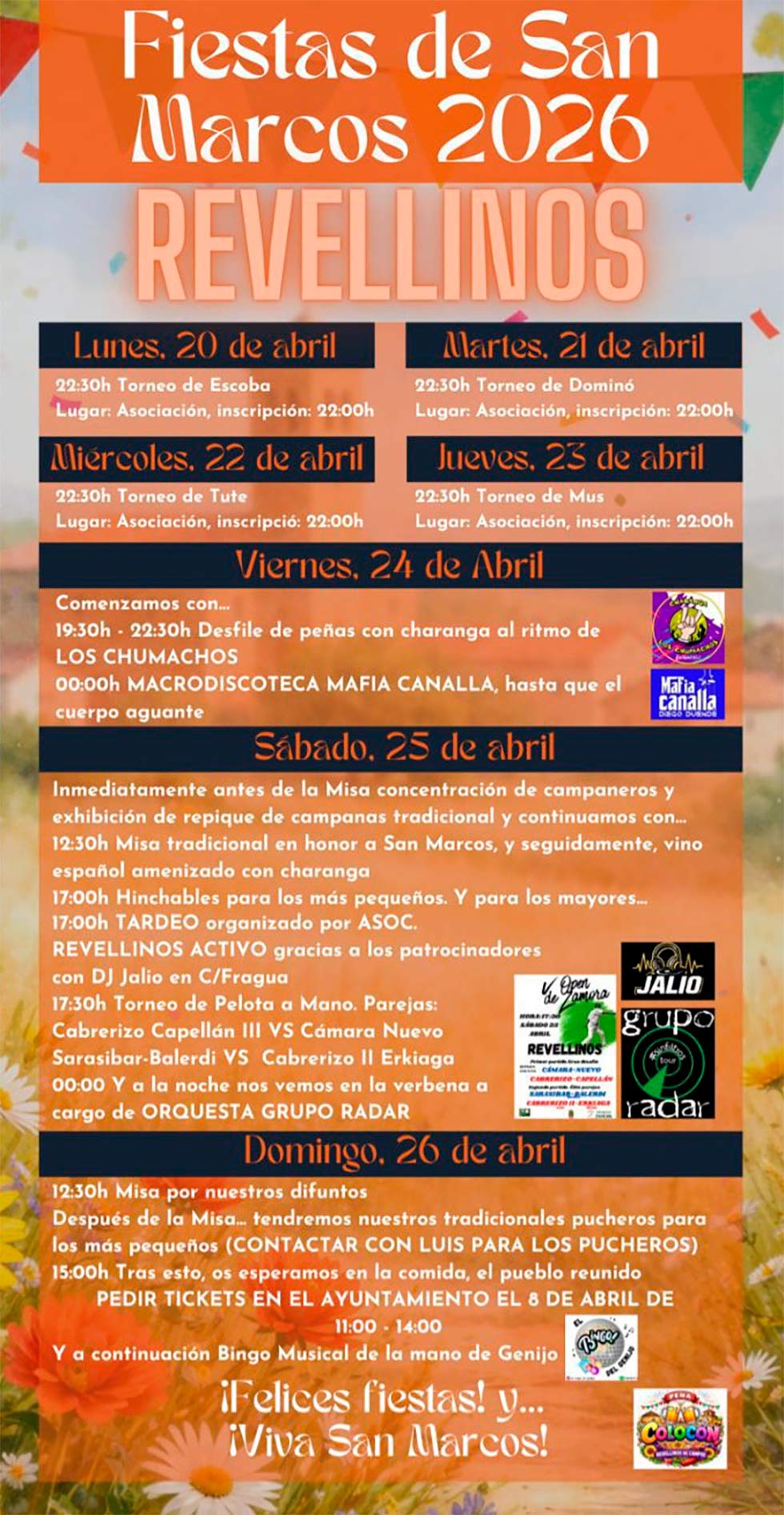 12:30h Misa tradicional en honor a San Marcos, y seguidamente, vino español amenizado con charanga