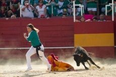 A las 18:00 horas saltaban al ruedo con las representantes de la juventud a la cabeza, los toreros y toreras de la Argolla, San Isidro, Malgrat y Paridón para demostrar su maestría con el capote. Una becerrada con pocos revolcones y con mucho arte sobretodo de las toreras que han demostrado que ellas también saben ponerse delante de un toro.