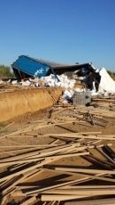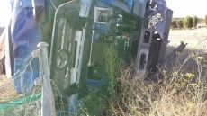 El camión propiedad de una empresa que se dedica a transportar mercancía variada, en esta caso vino, conservas y plástico en palets, permaneció volcado fuera de la calzada durante toda la mañana, y ha sido a lo largo de la tarde de hoy cuando se han realizado las labores de remolcado del vehículo.