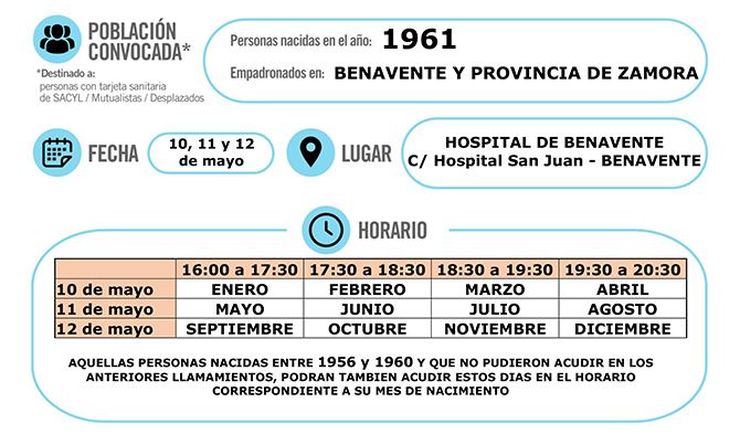 La vacunación a los nacidos en el año 1961 comienza hoy en Benavente correspondiente a los meses de enero, febrero, marzo y abril
