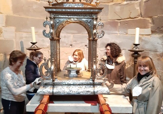 Sacando brillo a las andas para cobijar a la patrona de Benavente, la virgen de la Vega, en su procesión el próximo lunes