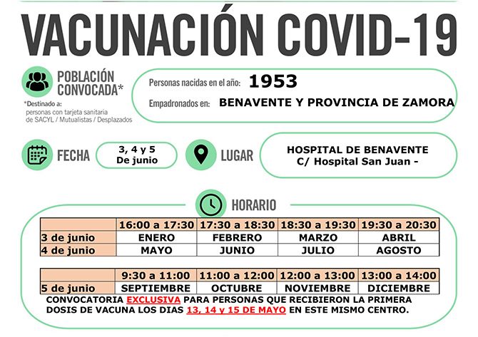 La segunda vacunación a los nacidos en 1953 comienza este jueves 3 de junio en el Hospital de Benavente